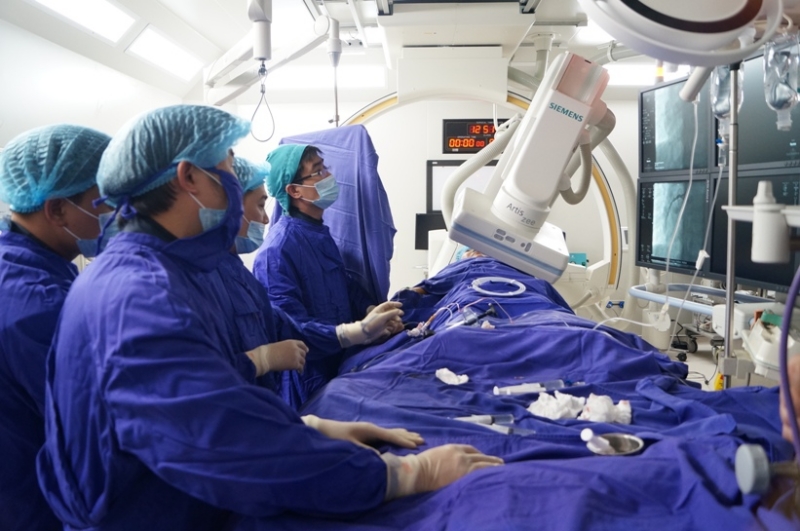 Cácbác sĩ khoa Tim mạch, Bệnh viện đa khoa tỉnh thực hiện can thiệp tim mạch cho bệnh nhân