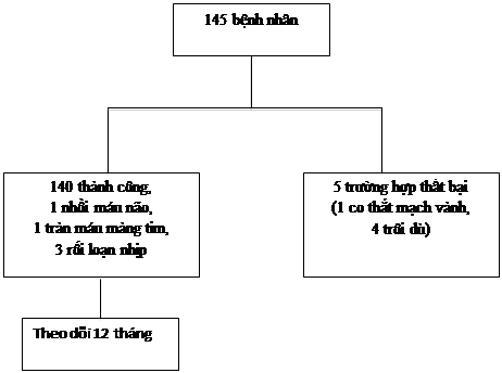 Kết quả:Có 145 bệnh nhân được bít lỗ thông bằng dụng cụ qua thông tim can thiệp trong thời gian nghiên cứu. Trong đó 39 bệnh nhân là nam giới (27%), tuổi trung bình 28 ± 19 (nhỏ nhất 5 tuổi, lớn nhất 71 tuổi). Thủ thuật thành công ở 140 bệnh nhân (96,5%). Có 5 trường hợp thất bại (3,5%). Có 1 trường hợp tràn máu màng ngoài tim, 1 trường hợp nhồi máu não. Có 4 trường hợp bị trôi dù. Không bệnh nhân nào tử vong trong quá trình theo dõi.