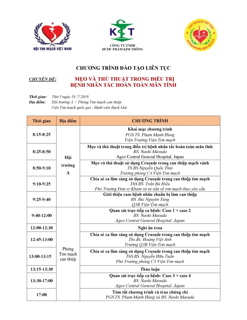 Ngày 19/07/2018 Viện Tim mạch phối hợp với Hội Tim mạch học Việt Nam và công ty TNHH Dược phẩm Kim Thông tổ chức chương trình đào tạo liên tục “Mẹo và thủ thuật trong điều trị bệnh nhân tắc hoàn toàn mạn tính”.