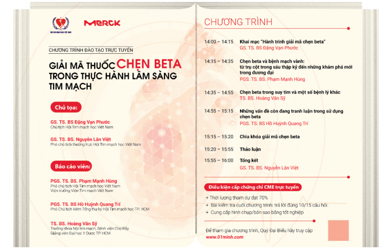 Ngày 14/03/2020 (thứ Bảy) Viện Tim mạch Việt Nam phối hợp với Hội Tim mạch học Việt Nam và công ty Merk tổ chức chương trình đào tạo trực tuyến “Giải mã thuốc Chẹn Beta trong thực hành lâm sàng tim mạch” với sự tham gia của các chuyên gia tim mạch hàng đầu đến từ Viện Tim mạch Việt Nam, Hội Tim mạch học Việt Nam, Bệnh viện Chợ Rẫy.