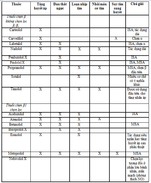 Bảng 3. Những thuốc chẹn β và sử dụng trong lâm sàng
