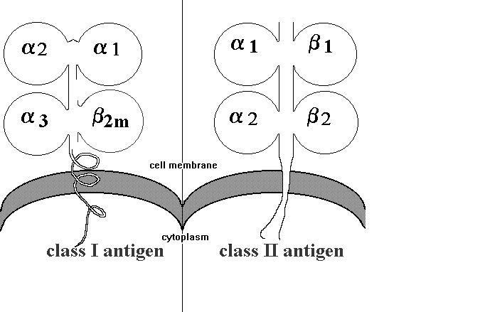Các MHC gồm 2 loại protein gọi là protein MHC lớp I và protein MHC lớp II. Cả 2 loại phân tử lớp I và lớp II đều là các glycoprotein bề mặt làm nhiệm vụ nhận diện kháng nguyên. Những kháng nguyên MHC lớp I có trên bề mặt ở tất cả các tế bào có nhân ở động vật có xương sống, còn protein MHC lớp II chỉ có trên bề mặt của một số loại tế bào như tế bào B, đại thực bào và các tế bào trình diện kháng nguyên viết tắt là APCs (Antigen Presenting Cells) giúp tế bào B tạo kháng thể [7], [12].