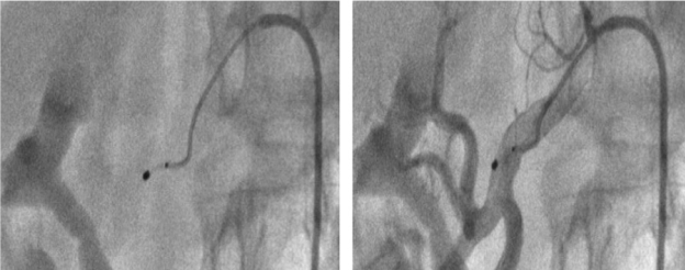 Hình 4 : Hình ảnh X quang của kỹ thuật triệt đốt thần kinh giao cảm động mạch thận trong các nghiên cứu Symplicity với ống thông đốt Symplicity®, Flex-Catheter, Medtronic/Ardian Inc. USA
