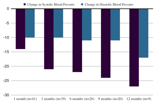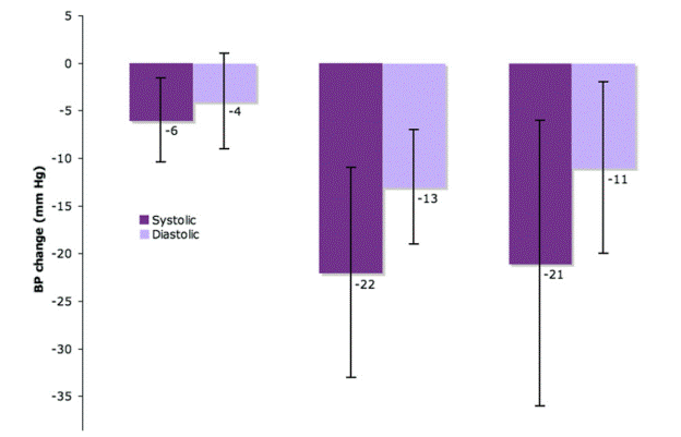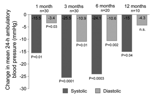 Kết quả nghiên cứu từ nhóm Jena cho thấy, sau 1 tháng, trên đo huyết áp liên tục 24 giờ, huyết áp tâm thu giảm trung bình 15,5 mmHg và huyết áp tâm trương giảm trung bình 3,4 mmHg, sự khác biệt có ý nghĩa thống kê với p