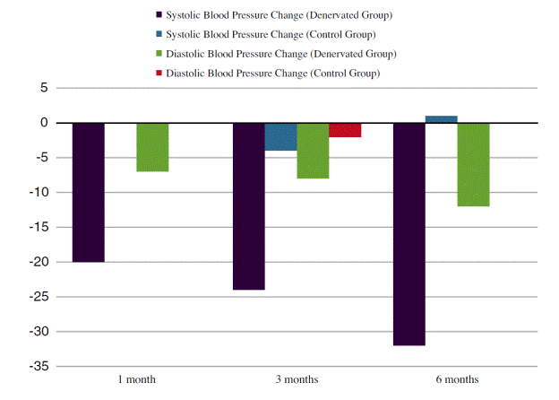 Có sự giảm đáng kể huyết áp ở các bệnh nhân được ghi nhận qua nghiên cứu Symplicity HTN-1: sau 1 tháng theo dõi, huyết áp tâm thu giảm trung bình 14 mmHg và huyết áp tâm trương giảm trung bình 10 mmHg; sau 12 tháng, kết quả hạ huyết áp không những được duy trì mà còn tốt hơn: giảm được 27 mmHg và 17 mmHg tương ứng với huyết áp tâm thu và huyết áp tâm trương. Trong quá trình theo dõi, 13 bệnh nhân phải điều chỉnh thuốc hạ huyết áp: 9 bệnh nhân giảm được số nhóm thuốc hạ huyết áp cũng như liều thuốc, 4 bệnh nhân phải tăng liều thuốc. Nghiên cứu cũng ghi nhận 13% bệnh nhân không đáp ứng huyết áp tích cực hơn sau thủ thuật. Trên 18 bệnh nhân tiếp tục được theo dõi đến 24 tháng, huyết áp tâm thu giảm được trung bình 33 mmHg, huyết áp tâm trương giảm được trung bình 17 mmHg.