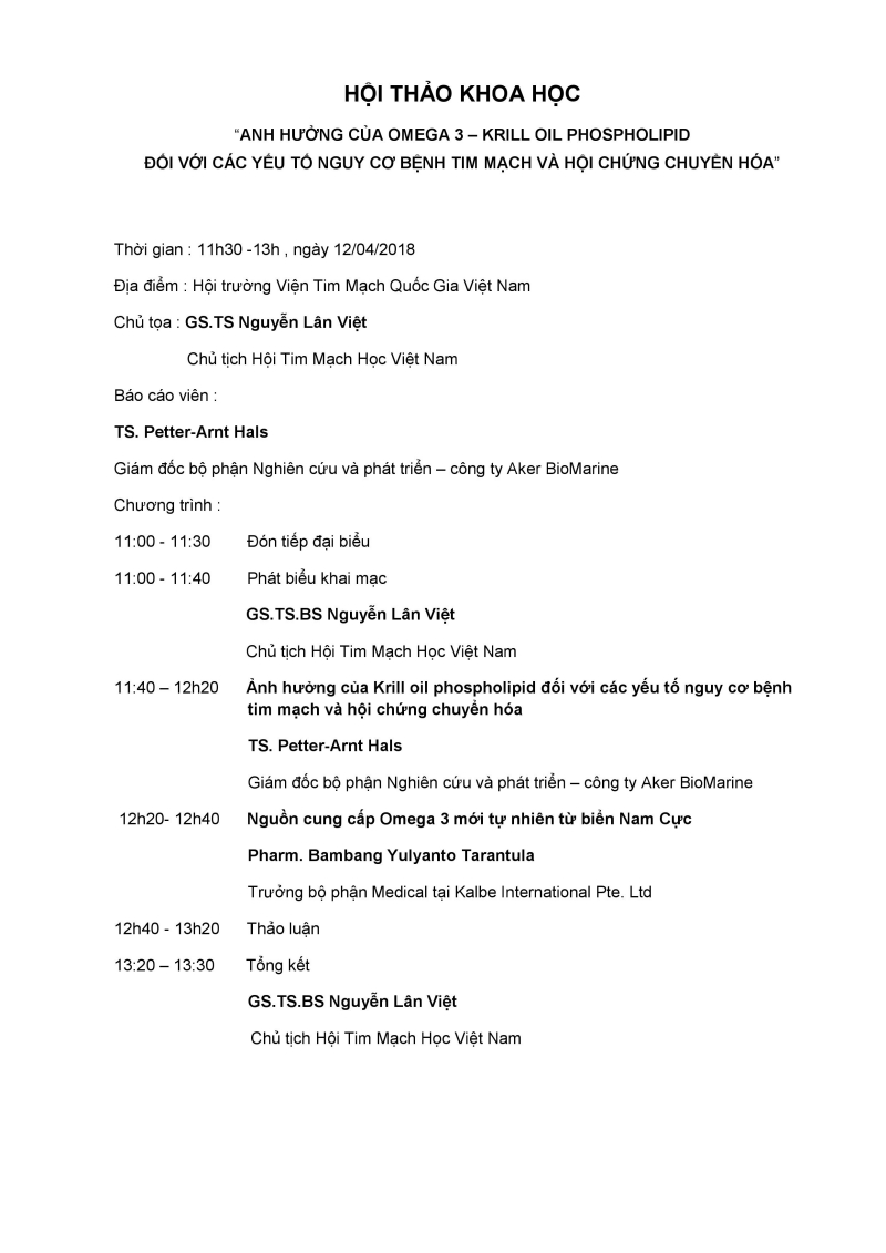 Ngày 12/4/2018 (thứ Năm) Viện Tim mạch Việt Nam phối hợp với hãng Kalbe International tổ chức Hội thảo “Ảnh hưởng của Omega 3 – Krill oil phospholipid đối với các yếu tố nguy cơ bệnh tim mạch và hội chứng chuyển hóa”