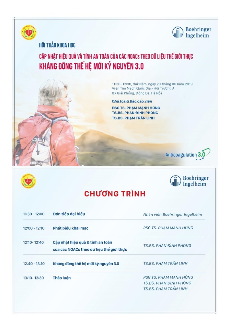 Ngày 20/6/2019 (thứ Năm) Viện Tim mạch Việt Nam phối hợp với hãng Boehringer Ingelheim tổ chức buổi hội thảo khoa học “Cập nhật hiệu quả và tính an toàn của các NOACs theo dữ liệu nghiên cứu thế giới thực – Kháng đông thế hệ mới kỷ nguyên 3.0”. Chương trình sẽ có sự tham gia của PGS.TS. Phạm Mạnh Hùng – Viện Trưởng Viện Tim mạch, TS. Phan Đình Phong – Trưởng phòng Q3A Viện Tim mạch, TS. Phạm Trần Linh – Trưởng phòng C5 Viện Tim mạch.