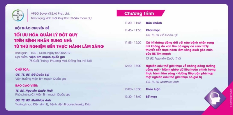 Ngày 5/5 (Thứ Sáu) Viện Tim mạch Việt Nam phối hợp với hãng Bayer sẽ tổ chức hội thảo chuyên đề “Tối ưu hóa quản lý đột quỵ trên bệnh nhân rung nhĩ: Từ thử nghiệm đến thực hành lâm sàng” với sự tham gia của các chuyên gia tim mạch đến từ Viện Tim mạch Việt nam và GS.TS.BS. Matthias Antz trưởng khoa Điện sinh lý, bệnh viện Braunschweig, Đức.