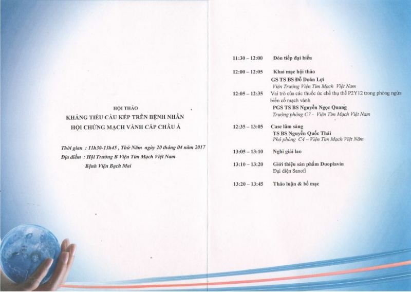11h30 ngày 20/4/2017 (thứ Năm), Viện Tim mạch Việt Nam phối hợp với hãng Sanofi tổ chức Hội thảo “Kháng tiểu cầu kép trên bệnh nhân hội chứng mạch vành cấp chấu Á” với sự tham gia của các chuyên gia mạch vành hàng đầu đến từ Viện Tim mạch Việt Nam.