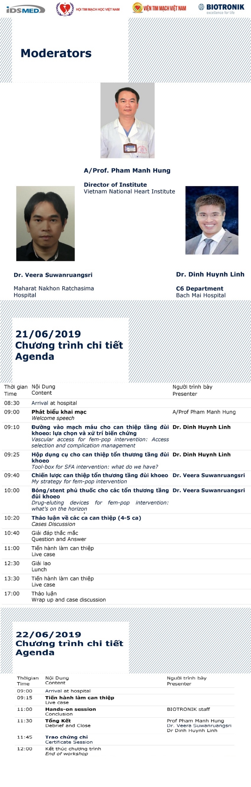 Ngày 21-22/6/2019 Viện Tim mạch Việt Nam phối hợp với Hội tim mạch học Việt Nam, công ty Biotronik tổ chức Hội thảo khoa học “Cập nhật các tiến bộ trong can thiệp nội mạch điều trị tổn thương tầng đùi – kheo” với sự tham gia của các chuyên gia tim mạch hàng đầu đến từ Viện Tim mạch Việt Nam và bác sĩ Veera Suwanruangsri đến từ bệnh viện Maharat Nakhon Ratchasima – Thái Lan.