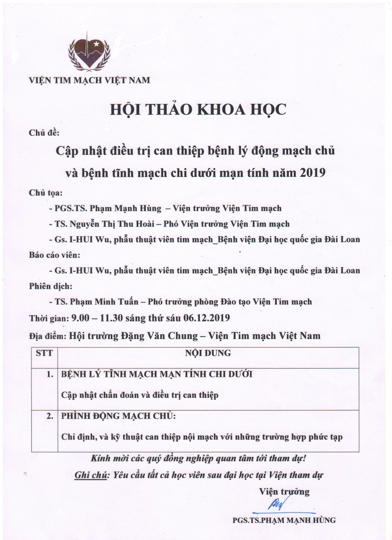 Ngày 06/12/2019 (Thứ Sáu) Viện Tim mạch Việt Nam phối hợp với Bệnh viện Đại học Quốc gia Đài Loan tổ chức buổi hội thảo khoa học chủ đề “Cập nhật điều trị can thiệp bệnh lý động mạch chủ và bệnh tĩnh mạch chi dưới mãn tính năm 2019”. Chương trình sẽ có sự tham gia của các chuyên gia Tim mạch hàng đầu đến từ Viện Tim mạch Việt Nam và GS. T-HUI Wu phẫu thuật viên Tim mạch đến từ bệnh viện Đại học Quốc gia Đài Loan.