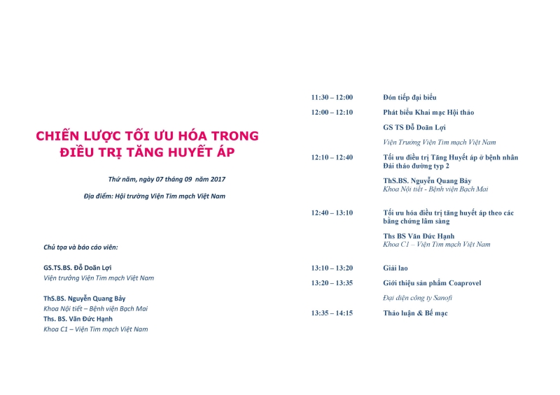 Ngày 07/09/2017 (Thứ Năm) Viện Tim mạch Việt Nam phối hợp với hãng Sanofi Hội thảo khoa học “Chiến lược tối ưu hóa trong điều trị tăng huyết áp”với sự tham gia của ThS. BS. Văn Đức Hạnh – Viện Tim mạch và ThS.BS. Nguyễn Quang Bảy – Khoa Nội tiết bệnh viện Bạch Mai.