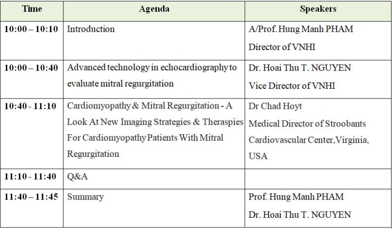 Ngày 13/02/2019 (thứ Tư) Viện Tim mạch Việt Nam tổ chức hội thảo khoa học với chủ đề “Hở van hai lá – Cập nhật về biện pháp chẩn đoán hình ảnh và chiến lược điều trị”. Chương trình sẽ có sự tham gia của PGS.TS. Phạm Mạnh Hùng – Viện trưởng Viện Tim mạch Việt Nam, TS. Nguyễn Thị Thu Hoài – Phó Viện trưởng Viện Tim mạch Việt Nam và Dr.Chad Hoyt – Giám đốc Trung tâm Tim mạch Stroobants,Virginia, Hoa Kỳ.