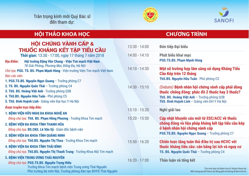 Tiếp nối thành công của Hội thảo kì I diễn ra vào ngày 19/06/2018. Ngày 17/07/2018 (thứ Ba) Viện Tim mạch Việt Nam phối hợp với hãng Sanofi tổ chức Hội thảo khoa học kỳ II với chủ đề “Hội chứng mạch vành cấp & Thuốc kháng kết tập tiểu cầu” với sự tham gia của các chuyên gia tim mạch hàng đầu đến từ Viện Tim mạch Việt Nam và Bộ môn Tim mạch trường Đại học Y Hà Nội. Chương trình sẽ được truyền trực tuyến đến 5 điểm cầu: Bệnh viện đa khoa tỉnh Quảng Ninh, bệnh viện đa khoa tỉnh Thanh Hóa, bệnh viện đa khoa tỉnh Thái Bình, bệnh viện Hữu Nghị đa khoa Nghệ An, bệnh viện Trung Ương Thái Nguyên.