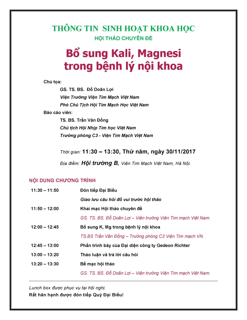 Ngày 30/11/2017 (thứ Năm) Viện Tim mạch Việt Nam phối hợp với công ty Gedeon Richter tổ chức buổi Hội thảo sinh hoạt khoa học chuyên đề “Bổ sung Kali, magnesi trong bệnh lý nội khoa” với sự tham gia của GS.TS. Đỗ Doãn Lợi – Viện Trưởng Viện Tim mạch Việt Nam (Chủ tọa đoàn) và TS. Trần Văn Đồng – Trưởng phòng C3 Viện Tim mạch Việt Nam.