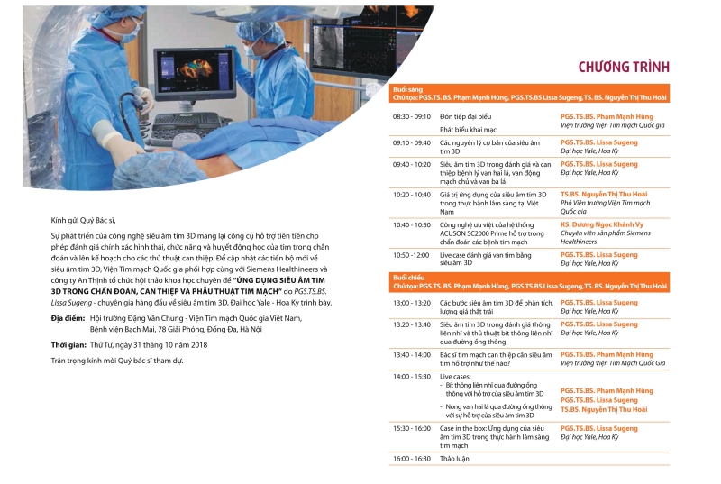 Sự phát triển của công nghệ siêu âm tim 3D mang lại công cụ hỗ trợ tiên tiến cho phép đánh giá chính xác hình thái, chức năng và huyết động học của tim trong chẩn đoán và lên kế hoạch cho các thủ thuật can thiệp. Để cập nhật các tiến bộ mới về siêu âm tim 3D Viện Tim mạch phối hợp với công ty Siemens Healthineers và công ty An Thịnh tổ chức hội thảo “Ứng dụng siêu âm tim 3D trong chẩn đoán, can thiệp và phẫu thuật tim mạch” do PGS.TS. Lissa Sugeng – chuyên gia hàng đầu về siêu âm tim 3D chuyên gia hàng đầu về siêu âm tim 3D, Đại học Yale – Hoa Kỳ trình bày.