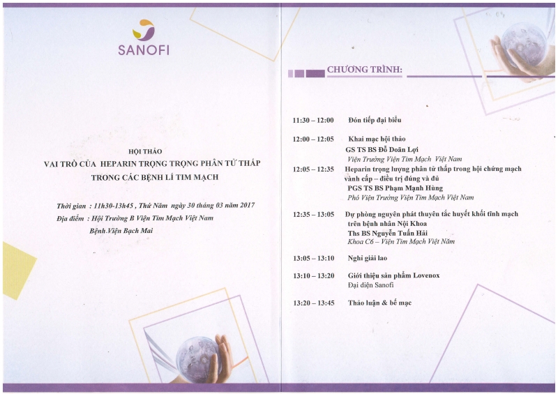 Ngày 30/03/2017 (thứ Năm) Viện Tim mạch Việt Nam phối hợp với công ty Sanofi tổ chức hội thảo “Vai trò của Heparin trọng lượng phân tử thấp trong các bệnh lý tim mạch” với sự tham gia của các chuyên gia tim mạch hàng đầu đến từ Viện Tim mạch Việt Nam. Trân trọng kính mời quý đồng nghiệp tham dự và đóng góp cho hội thảo.