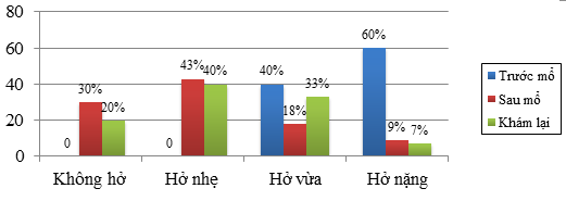 So sánh mức độ hở hẹp VBL thời điểm trước mổ, sau mổ và khám lại. Trước mổ: 100% BN hở VBL từ vừa đến nặng (hở nặng 60%), hẹp hở VBL 6%. Sau mổ: 26,6% hở VBL từ vừa đến nặng (8,6% hở nặng). Khám lại: hở vừa 33%; hở nặng 7%, không có BN hẹp VBL. Có thể thấy tỷ lệ hở VBL so với trước mổ có cải thiện rõ rệt, tuy nhiên tỷ lệ hở VBL từ vừa đến nặng còn tương đối cao. Các nghiên cứu nước ngoài cho thấy tỷ lệ hở VBL vừa đến nặng sau mổ dao động từ 26 – 38% [10].