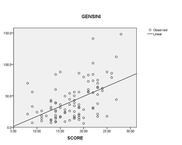Phân loại tổn thương ĐMV theo SCAI: 56.86% Loại I, 34.11% Loại II; 1.00% Loại III và 8.03% loại IV. 2. Đặc điểm về tuổi động mạch. Đặc điểm về số điểm SCORE Điểm SCORE trung bình 17.71 ± 4.72 điểm ( 8-28) Tuổi đời trung bình 61,89 ±10,28 tuổi với tuổi thấp nhất là 41 Tuổi động mạch trung bình 74,6±8,42 với tuổi thấp nhất là 48 tuổi So sánh trung bình hai loại tuổi này cho thấy tuổi động mạch lớn hơn tuổi đời có ý nghĩa thống kê với p=0,008 3. Đặc điểm tổn thương ĐMV theo thang điểm Gensini Điểm Gensini trung bình : 41,86±29,46 điểm ( 6-148 điểm) Phân chia độ nặng tổn thương ĐMV tính theo thang điểm Gensini : Nhẹ (≤ 23đ) 32,6%, Trung bình (24-54đ) 35,8%, Nặng(>54 đ): 31,6% 4. Liên quan giữa tổng điểm SCORE, tuổi động mạch và độ nặng tổn thương ĐMV theo thang điểm Gensini Bảng 5. Phân bố tổng điểm SCORE theo độ nặng Gensini