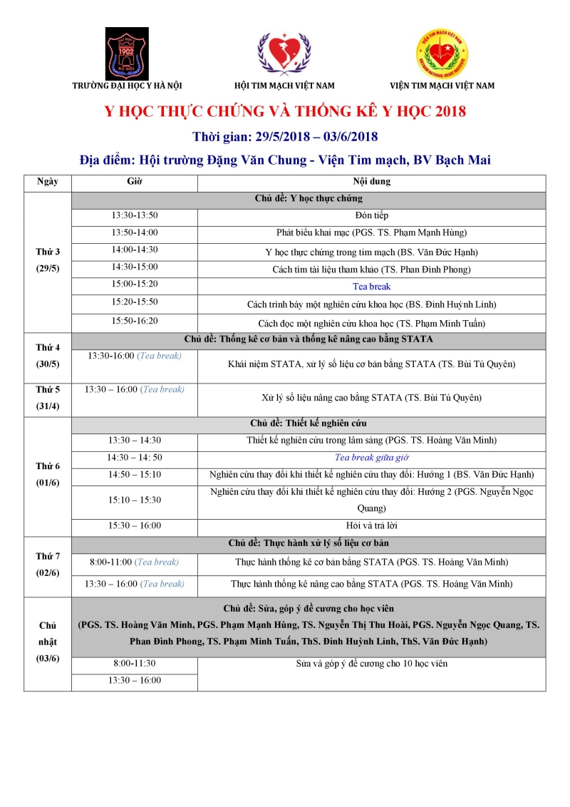 Từ ngày 29/05 đến 03/06/2018 Viện Tim mạch Việt Nam phối hợp với Hội Tim mạch học Việt Nam, Trường Đại học Y Hà Nội tổ chức khóa đào tạo “Y học thực chứng và thống kê y học 2018”.