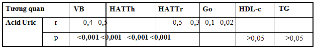 – Có mối tương quan mức độ vừa giữa nồng độ acid uric huyết thanh với số đo vòng bụng (r = 0,4; p