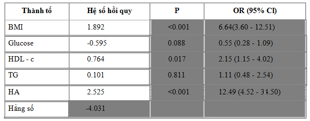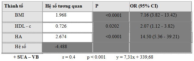 Xem xét những thành tố của HCCH (trong đó vòng bụng được thay BMI) liên quan đến tăng SUA, bằng kỹ thuật hồi quy logistic cho thấy tăng SUA chịu ảnh hưởng nhiều nhất của THA [OR:14,50, KTC 95%: (5.36 -39.21), p