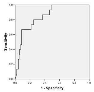 Trên hình 1 là đường cong ROC biểu diễn độ nhạy và độ đặc hiệu của nồng độ NT-proBNP trong dự báo tử vong sau 30 ngày. Diện tích dưới đường cong là 0,843. Từ phân tích tương quan giữa độ nhạy với độ đặc hiệu, chúng tôi xác định điểm cắt nồng độ NT-proBNP để có độ nhạy và độ đặc hiệu tối ưu trong dự báo tử vong sau 30 ngày là 1832,5 pg/ml (độ nhạy 80% và độ đặc hiệu 74,6%). Ứng với điểm cắt này, số ca tử vong trong vòng 30 ngày có điểm cắt dưới ngưỡng là 3 và trên ngưỡng là 12 ca.
