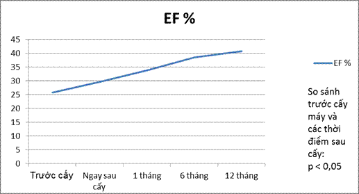 Biểu đồ 6 và 7 cho thấy ĐK cuối tâm trương và ĐK cuối tâm thu thất trái giảm dần rõ rệt từ sau 1 tháng đầu cấy CRT tới tháng thứ 6 và tiếp tới tháng thứ 12. Sự cải thiện kích thước các buồng tim song hành với sự gia tăng phân suất tống máu. Kết quả nghiên cứu MIRACLE [4] cho thấy CRT giúp kéo dài thời gian đổ đầy thất sẽ cải thiện EF, làm rút ngắn thời gian dẫn truyền chậm trễ của hai thất giúp đồng bộ hóa và tối ưu hóa co bóp của hai thất.