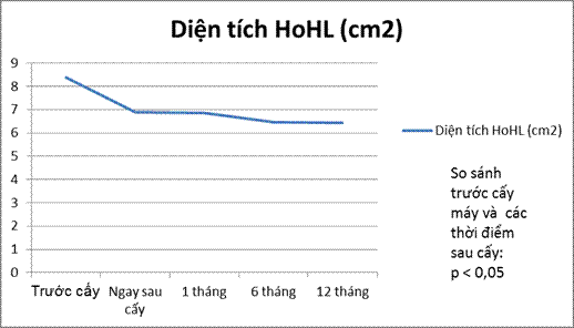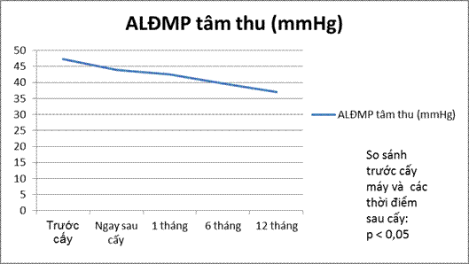 Biểu đồ 4 đến 9 cho thấy CRT trên cơ sở kết hợp với các thuốc điều trị nội khoa tối ưu khác đã giúp cải thiện rõ rệt triệu chứng cơ năng (giảm độ NYHA), giảm kích thước các buồng tim, nâng cao phân suất tống máu thất trái, giảm ALĐMP, giảm mức độ HoHL khi so sánh đôi một giữa thời điểm trước cấy máy với các thời điểm 1 tháng, 6 tháng và 12 tháng. Như vậy, ở tất cả các thời điểm theo dõi sau cấy máy, ta thấy CRT đã giúp cải thiện rõ rệt các thông số lâm sàng và siêu âm tim.