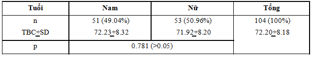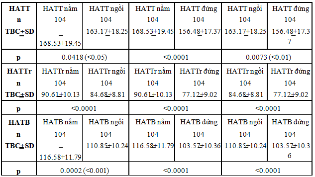 Nhận xét: Theo nghiên cứu của chúng tôi, số bệnh nhân nam lớn tuổi có THA là 51 bệnh nhân chiếm tỉ lệ 49.04%; số bệnh nhân nữ lớn tuổi có THA là 53 bệnh nhân chiếm tỉ lệ 50.96%, không khác biệt có ý nghĩa thống kê về tuổi và giới ở người cao tuổi có THA (p>0.05). 3.2. Phân bố huyết áp theo tư thế của bệnh nhân Bảng 2