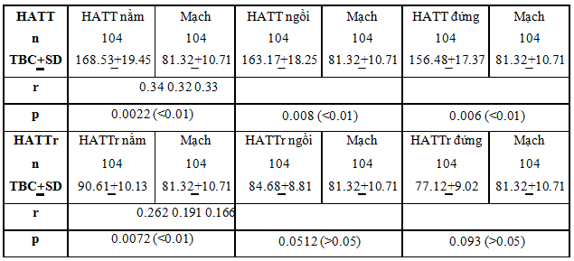 Nhận xét: Theo nghiên cứu của tác giả Mark A. Supiano (2009), nghiên cứu dịch tễ học về THA ở người lớn tuổi có THA nhận thấy: Tỉ lệ hạ huyết áp theo tư thế nằm, ngồi và đứng khác biệt có ý nghĩa thông kê (p=0.0002)[9]. Theo nghiên cứu Jamerson et al. (2007), tác giả nghiên cứu huyết áp tư thế nằm và tư thế đứng ở lứa tuổi >45đi đến kết luận: Huyết áp tư thế nằm cao hơn huyết áp tư thế đứng khác biệt có ý nghĩa thống kê (p= 0.003)[8]. Trong nghiên cứu của chúng tôi, hạ huyết tư thế từ nằm sang ngồi, từ ngồi sang đứng ở cả ba tư thế: Huyết áp tâm thu (HATT), huyết áp tâm trương (HATTr) và huyết áp trung bình (HATB) đều khác biệt có ý nghĩa thống kê (p 3.3. Tương quan huyết áp theo tư thế với một số yếu tố 3.3.1. Tương quan huyết áp theo tư thế với mạch Bảng 3