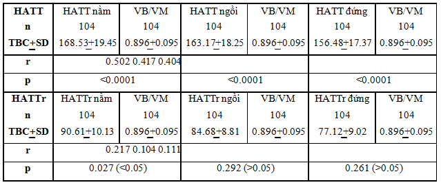 Nhận xét: Denardo et al. (2010), nghiên cứu tiến cứu thấy có sự tương quan thuận có ý nghĩa thống kê giữa huyết áp với mạch (p0.05). 3.3.2. Tương quan huyết áp theo tư thế với tỉ VB/VM Bảng 4