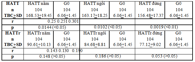 Nhận xét: Theo nghiên cứu của tác giả Lê Thanh Chiến và cs. (2013), khảo sát mối tương quan giữa THA với tỉ VB/VM thì đi đến kết luận: Béo phì theo tỉ số eo mông (béo phì dạng nam) làm tăng nguy cơ THA gấp 3,2 lần. Tỉ lệ VB/VM = 0,82 chung cho hai giới, độ nhạy là 77% và độ đặc hiệu là 48,8%. Ở nữ giới, với tỉ lệ VB/VM = 0,82 thì độ nhạy là 77,9% và độ đặc hiệu là 53,6%. Ở nam, với VB/VM = 0,88 thì độ nhạy là 55,2% và độ đặc hiệu là 58,6%. Tỉ số VB/VM cao có khả năng ảnh hưởng đến THA [1]. Theo nghiên cứu của chúng tôi, có sự tương quan thuận khá chặt chẽ giữa HATT tư thế nằm, ngồi và đứng với tỉ VB/VM với hệ số tương quan r và p lần lượt là: (0.502, 0.05). 3.3.3. Tương quan huyết áp theo tư thế với đường máu lúc đói (G0) Bảng 5 Nhận xét: Theo nghiên cứu của tác giả Trần Kim Phụng (2011), nghiên cứu tình hình THA tại thành phố Đông Hà, tỉnh Quảng Trị, mẫu nghiên cứu là 461 người tác giả đi đến kết luận: Các yếu tố nguy cơ liên quan đến THA gồm: Thừa cân (OR=3,8); béo bụng (OR=2,53); tăng LDL-C (OR=2,15) và tăng triglycerid máu (OR=2,25). Tần suất THA gia tăng rõ ở người lớn tuổi, thừa cân, béo bụng, rối loạn chuyển hóa lipid tăng đường máu và ĐTĐ[4]. Theo nghiên cứu của tác giả Trần Hữu Dàng (2008), tác giả Nguyễn Hải Thủy (2008), tác giả Nguyễn Khoa Diệu Vân (2009) đều kết luận: Có mối tương quan thuận chặt chẽ giữ huyết áp với đường máu lúc đói [2],[5],[6]. Nghiên cứu của chúng tôi, có sự tương quan thuận giữa HATT tư thế nằm, ngồi, đứng với đường huyết lúc đói (G0) với hệ số tương quan và p lần lượt là: (0.25, 3.3.4. Tương quan huyết áp theo tư thế với vòng bụng (VB) Bảng 6
