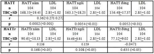 Nhận xét: Theo nghiên cứu của Trần Thị Mỹ Loan và cs. (2009), nghiên cứu mối tương quan giữa chỉ số khối cơ thể và rối loạn lipid máu ở bệnh nhân THA, tác giả nghiên cứu trên 300 đối tượng THA chủ yếu THA giai đoạn I. Trị số trung bình BMI của người THA là: 23,76 ± 3,06, cao hơn hẳn so với BMI của dân số chung. Tỉ lệ rối loạn lipid máu trên bệnh nhân THA là 71,67%, trong đó chiếm tỉ lệ cao nhất là tăng cholesterol toàn phần (67,3%), kế đến tăng triglycerid chiếm tỉ lệ 54,3% và tăng LDL-C chiếm tỉ lệ 32%, giảm HDL-C chiếm tỉ lệ thấp nhất. BMI chỉ có tương quan với cholesterol toàn phần (hệ số r = 0,303, p=0,000) và triglycerid (hệ số r = 0,208, p=0,000). Nghiên cứu của chúng tôi, có sự tương quan thuận khá chặt chẽ giữa HATT theo tư thế nằm, ngồi, đứng với cholesterol máu với hệ số tương quan r và p theo thứ tự là: (0.376, 0.05). 3.3.6. Tương quan huyết áp theo tư thế với LDL máu Bảng 8