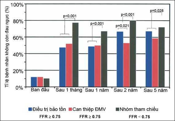 Khi điều trị bảo tồn những tổn thương lẽ ra có thể cần can thiệp (nếu chưa có FFR), câu hỏi đặt ra với thầy thuốc là: liệu điều đó có tăng nguy cơ cho bệnh nhân hay không. Nghiên cứu NUCLEAR cùng nhiều công trình khoa học đã chứng minh: nếu bệnh nhân thực sự có tình trạng thiếu máu cơ tim, trì hoãn tái tưới máu sẽ làm tăng biến cố tim mạch trong tương lai [20, 21] . Tuy nhiên, kết quả theo dõi 5 năm 315 bệnh nhân của nghiên cứu DEFER cho thấy, ở bệnh nhân hẹp vừa ĐMV nếu FFR≥0,75, điều trị nội khoa không làm tăng tỉ lệ NMCT và tử vong do tim mạch, so với tái tưới máu (p=0,21) [14] . Trong 2 năm đầu tiên, triệu chứng cơ năng ở nhóm điều trị nội khoa tương tự nhóm can thiệp. Nhưng sau đó triệu chứng cơ năng của nhóm điều trị bảo tồn có xu hướng tốt hơn, thể hiện bằng tỉ lệ hết đau ngực tăng lên, p=0,021 (hình 21). Nghiên cứu DEFER cho phép kết luận, với tổn thương hẹp ĐMV không gây ảnh hưởng huyết động (FFR âm tính), can thiệp tái tưới máu không ưu việt hơn điều trị bảo tồn, xét trên phương diện cải thiện triệu chứng cũng như dự phòng các biến cố tim mạch lớn cho người bệnh [14] .