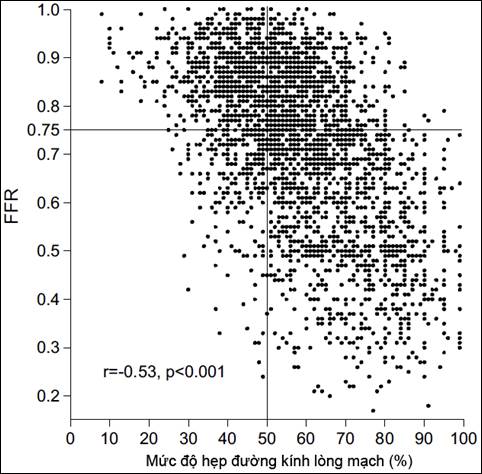 Trong nghiên cứu của chúng tôi, FFR có tương quan tuyến tính với các thông số đo được trên QCA (đường kính lòng mạch tối thiểu, diện tích lòng mạch tối thiểu, % hẹp đường kính lòng mạch, % hẹp diện tích lòng mạch, chiều dài tổn thương). Tuy nhiên đây chỉ là mối tương quan mức độ trung bình (với giá trị |r| từ 0,43 đến 0,64). Nếu dựa đơn thuần vào mức độ hẹp lòng mạch, chỉ có 19% trường hợp ngoại suy được kết quả FFR (bảng 8).