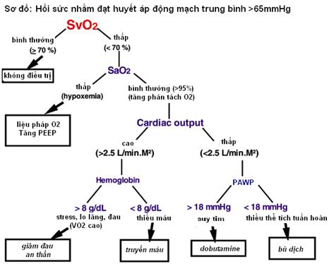 - SVO2 >70% là mục đích có nhiều giá trị thực tiễn. Nếu SvO230% và/hoặc sử dụng phối hợp dobutamine để tăng cải thiện chỉ số tim CI và khả năng vận chuyển oxy DO2. Hướng dẫn hồi sức huyết động theo SVO2 có thể được tóm tắt theo sơ đồ sau :