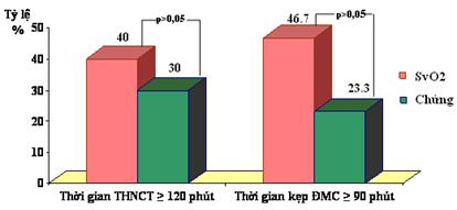 - Tỷ lệ bệnh nhân có thời gian chạy tuần hoàn ngoài cơ thể (THNCT)≥120phút và/hoặc thời gian cặp động mạch chủ (ĐMC)≥90phút ở nhóm SVO2 cao hơn (40% vs. 30%, và 46,7% vs. 23,3%)