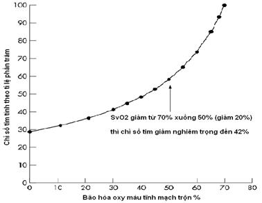 - Theo dõi giá trị SVO2 đặc biệt thích hợp ở các bệnh nhân có rối loạn chức năng tim mạch vì đây là một thông số có tính nhạy cảm và tương quan rất chặt chẽ với chỉ số tim (bảng 6 và biểu đồ 3). Bão hòa oxy máu tĩnh mạch trộn là thông số phản ánh toàn bộ hiệu suất của hệ thống tim – hô hấp [4]. Một sự tụt giảm giá trị SVO2 khoảng 20% tương đương với giảm chỉ số tim khoảng 42% (biểu đồ 3). Giá trị SVO2 giảm 10% là yếu tố gợi ý cần thiết phải có can thiệp trong vấn đề hồi sức huyết động.