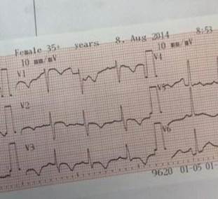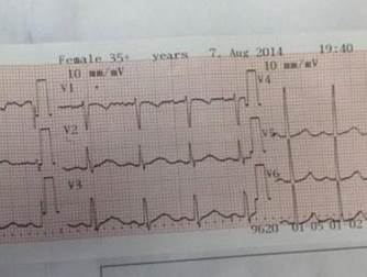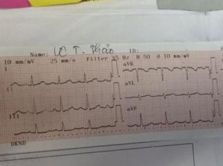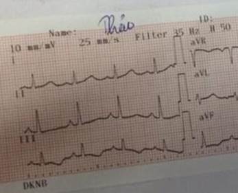 Hình 1: Điện tim lúc bệnh nhân nhập viện (Nhịp nhanh xoang, T âm ở V1).