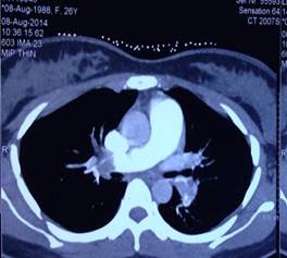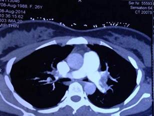 Tắc động mạch phổi cấp được nghi ngờ là nguyên nhân gây sốc, vì bệnh nhân có đau ngực, khó thở, nhịp tim nhanh, có thai 12 tuần và lâm sàng, điện tim có biểu hiện suy tim phải cấp. Chỉ định chụp cắt lớp vi tính (CLVT) động mạch phổi cấp cứu được xem xét. Theo Uỷ ban quốc tế về an toàn phóng xạ (The International Commission of Radiologic Protection), liều tia xạ khi chụp CLVT động mạch phổi phóng qua tử cung người mẹ không làm tăng nguy cơ tử vong hoặc dị tật thai nhi [1]. Bệnh nhân được chụp CLVT 64 dãy động mạch phổi, kết quả cho thấy huyết khối ở cả 2 động mạch phổi phải và trái với mức độ nặng (SI) CLVT là 50%.
