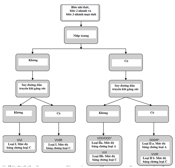 Lựa chọn kiểu tạo nhịp cho suy nút xoang. Có một vài thử nghiệm lâm sàng về lựa chọn kiểu tạo nhịp cho bệnh nhân bệnh lý nút xoang đã được nghiên cứu. Các thử nghiệm này so sánh giữa tạo nhịp nhĩ và thất, giữa tạo nhịp 1 buồng và 2 buồng đánh giá dựa trên các tiêu chí đánh giá như tỷ lệ tử vong, rung nhĩ, tỷ lệ tai biến mạch não và huyết khối, suy tim, hội chứng máy tạo nhịp và chất lượng cuộc sống của bệnh nhân. Thử nghiệm đầu tiên về vấn đề này nghiên cứu so sánh giữa tạo nhịp thất và tạo nhịp nhĩ bởi Andersen và cộng sự [10]. Nghiên cứu tiến hành trên 225 bệnh nhân suy nút xoang và có dẫn truyền nhĩ thất bình thường ngẫu nhiên tiếp nhận tạo nhịp nhĩ hoặc tạo nhịp thất. Thời gian theo dõi là 5,5 năm. Thử nghiệm đã cho thấy tạo nhịp nhĩ kiểu AAI có tỷ lệ rung nhĩ, huyết khối, suy tim, tỷ lệ tử vong do tim mạch và tỷ lệ tử vong toàn bộ thấp hơn hẳn với kiểu tạo nhịp thất kiểu VVI. Tỷ lệ tử vong toàn bộ ở nhóm tạo nhịp nhĩ là 19% so với 34% ở nhóm tạo nhịp thất (p=0,065). Tuy nhiên, những kết quả của thử nghiệm Andersen lại không được thấy ở trên 3 thử nghiệm lâm sàng lớn hơn. Thử nghiệm PASE [11] nghiên cứu trên 407 bệnh nhân trong đó có 175 bệnh nhân suy nút xoang được tiếp nhận kiểu tạo nhịp DDDR hoặc kiểu VVIR. Bệnh nhân được theo dõi trong thời gian 2,5 năm. Kết quả cho thấy không có sự khác biệt có ý nghĩa thống kê giữa hai kiểu tạo nhịp trong tỷ lệ huyết khối, tai biến mạch não, rung nhĩ và chất lượng cuộc sống của bệnh nhân. Dù tỷ lệ tử vong toàn bộ có vẻ cao hơn chút ít ở nhóm VVIR (8,8% một năm) khi so với nhóm DDDR (5,2% một năm; p=0,09). Tuy nhiên, thử nghiệm này có thời gian theo dõi ngắn và nhóm sử dùng VVIR nhiều hơn hẳn so với nhóm sử dụng DDDR nên có thể ảnh hưởng đến kết quả phân tích. Thử nghiệm CTOPP [12], một thử nghiệm ngẫu nhiên tiến cứu trên 2568 bệnh nhân không có rung nhĩ mạn tính ngẫu nhiên tiếp nhận hoặc tạo nhịp thất (n=1474) hoặc tạo nhịp nhĩ (n=1094). 42% bệnh nhân trong thử nghiệm này là chỉ định suy nút xoang. Sau thời gian theo dõi trung bình 3,1 năm, tỷ lệ tử vong toàn bộ của 2 nhóm giống nhau (6,3% ở nhóm tạo nhịp sinh lý và 6,6% ở nhóm tạo nhịp thất; P=0,92). Nghiên cứu cũng không cho thấy sự khác biệt giữa hai nhóm trong tỷ lệ tai biến mạch não hay nhập viện vì suy tim. Dù vậy, tạo nhịp sinh lý làm giảm 18% liên quan đến rung nhĩ mạn tính. Thử nghiệm MOST [13] nghiên cứu trên 2010 bệnh nhân suy nút xoang được ngẫu nhiên tiếp nhận kiểu tạo nhịp hoặc DDDR hoặc VVIR. Qua thời gian theo dõi trung bình 2,76 năm đã không có sự khác biệt có ý nghĩa thông kê giữa hai nhóm trong tỷ lệ tử vong hoặc tai biến mạch não, nhưng tỷ lệ rung nhĩ thấp hơn 21%, tỷ lệ nhập viện do suy tim thấp hơn 27% và chất lượng cuộc sống tốt hơn ở nhóm DDDR so với nhóm VVIR. Nhưng quan trọng hơn trong nghiên cứu này là có 37,7% bệnh nhân đã phải chuyển kiểu tạo nhịp từ VVIR sang DDDR do hội chứng máy tạo nhịp. Cuối cùng một thử nghiệm quan trọng khác liên quan đến làm giảm rung nhĩ trên bệnh nhân suy nút xoang. Thử nghiệm SAVE PACE [14] tiến hành trên 1065 bệnh nhân suy nút xoang có dẫn truyền nhĩ thất bình thường được ngẫu nhiên tiếp nhận tạo nhịp 2 buồng hoặc tạo nhịp 2 buồng thất dùng đặc tính làm giảm tối đa tạo nhịp thất. Thử nghiệm này cho thấy tạo nhịp 2 buồng thất làm giảm tối đa tạo nhịp thất làm giảm 40% nguy cơ rung nhĩ (p=0,009). Như vậy, ta thấy rằng lựa chọn kiểu tạo nhịp là khá phức tạp. Lựa chọn kiểu tạo nhịp trong suy nút xoang được trình bày ở hình 1 [15]. Tạo nhịp thất 1 buồng có vẻ như không được khuyến cáo. Như vậy, trong suy nút xoang chúng ta có thể cân nhắc giữa kiểu tạo nhịp AAI hoặc DDD, dù kiểu tạo nhịp DDD có giá thành cao hơn nhưng có thể hạn chế được tiến triển blốc nhĩ thất trong tương lai dù điều này chiếm tỷ lệ rất nhỏ chỉ 1% [16]. Bất chấp điều này, do vấn đề kinh phí một số bệnh nhân suy nút xoang có rung nhĩ vẫn được cấy kiểu VVI hoặc VVIR ở nước ta [3][4] TẠO NHỊP TRONG BỆNH LÝ HỆ THỐNG DẪN TRUYỀN NHĨ THẤT Blốc nhĩ thất là chỉ định đầu tiên được áp dụng trên lâm sàng của tạo nhịp tim [1,2]. Đến ngày nay nó vẫn duy trì như là nguyên nhân phổ biến nhất phải cấy máy tạo nhịp tim trên thế giới [5] cũng như tại Việt nam [3][4]. Blốc nhĩ thất được phân loại lâm sàng dựa trên dấu hiệu điện tâm đồ (blốc nhĩ thất cấp I, cấp II, cấp III), vị trí giải phẫu nơi bị blốc, biểu hiện lâm sàng, hoàn cảnh lâm sàng, độ nặng nhẹ, nguyên nhân blốc và tình trạng lâm sàng kèm theo. Mỗi phân loại này có thể đưa ra hướng điều trị cho bệnh nhân. Các triệu chứng thường gặp của blốc nhĩ thất thường là ngất, choáng váng, mệt, đau ngực và triệu chứng suy tim. Tuy nhiên, triệu chứng nặng nề thường gặp nhất là cơn Adams-Stokes hoặc cơn tim nh