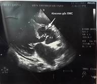 | Hình 1,2: Hình ảnh abscess gốc ĐMC và vách liên thất trên siêu âm tim. | |