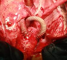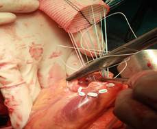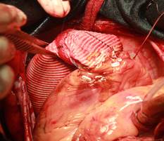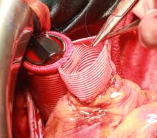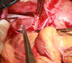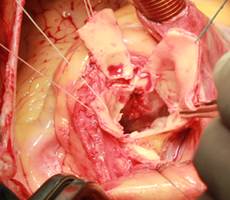 Sau khi gây mê toàn thân, bệnh nhân được mở ngực theo đường giữa xương ức, heparin toàn thân, tuần hoàn ngoài cơ thể ở nhiệt độ thường giữa động mạch chủ lên với 2 tĩnh mạch chủ, bơm dung dịch liệt tim trực tiếp 2 lỗ vành qua đường mở gốc động mạch chủ. Kiểm tra gốc động mạch chủ thấy áp xe toàn bộ vòng van lan xuống dưới vách liên thất. Nhiều mủ màu sô cô la trào lên từ vách liên thất. Cắt lọc toàn bộ khối áp xe vòng van động mạch chủ và một phần vách liên thất cho đến khi quan sát bằng mắt thường thấy tổ chức lành, không còn mủn nát và mủ. Kiểm tra van hai lá thấy có sùi lá trước kích thước bé 3 – 5mm, đứt dây chằng lá trước gây hở van nhiều, tổn thương chưa lan vào vòng van. Cắt bỏ van hai lá, bơm rửa làm sạch các buồng tim bằng nước muối sinh lý 9‰. Đóng gốc động mạch chủ lại bằng chỉ Prolene 5.0. Cắt mỏm thất trái một lỗ có đường kính 18mm rồi tiến hành làm miệng nối với ống mạch nhân tạo số 27. Một ống mạch nhân tạo số 27 khác có kèm theo van được nối với động mạch chủ xuống đoạn ngang mỏm tim. Sau đó hai đoạn mạch này được nối lại với nhau tạo thành một cầu nối có van nhân tạo giữa mỏm tim và động mạch chủ xuống. Thay van hai lá cơ học số 31. Hai lỗ động mạch vành được nối với động mạch chủ lên bằng những ống mạch nhân tạo đường kính 6mm (Hình 4). Sau khi đầy tim đuổi khí và thả cặp động mạch chủ, tim đập trở lại với tình trạng block nhĩ thất hoàn toàn. Đặt điện cực thượng tâm mạc và dẫn theo máy tạo nhịp để đạt tần số tối ưu. Ngừng máy tim phổi nhân tạo, rút các ống, trung hoà Heparin và đóng ngực theo giải phẫu.