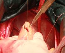 Viêm nội tâm mạc nhiễm khuẩn có áp xe vòng van động mạch chủ lan xuống vách liên thất là một bệnh lý không phải hiếm gặp trong thực hành phẫu thuật tim mạch. Với nguyên tắc cắt lọc tối đa tổ chức nhiễm khuẩn, nhiều lúc không thể bảo tồn được đường ra thất trái để tiến hành thay van nhân tạo. Bên cạnh đó, trên nền mô cơ tim phù nề cũng có thể làm cho những mũi khâu cố định van tim nhân tạo không chắc chắn và có thể bị bục ra [1]. Trong quá trình phẫu thuật cho bệnh nhân trên, sau khi cắt lọc và phẫu tích toàn bộ tổ chức áp xe ở vòng van động mạch chủ và ở vách liên thất, chúng tôi thấy nếu thay van tim nhân tạo theo cách thường quy sẽ có rất nhiều nguy cơ: do hầu như toàn bộ cấu trúc đường ra thất trái đã bị phá huỷ nên khó có thể xác định được vị trí phù hợp để đặt van nhân tạo, bên cạnh đó mô cơ tim lành còn lại không đủ đảm bảo chắc chắn cho những mũi khâu cố định. Vì vậy chúng tôi quyết định đóng gốc động mạch chủ và tiến hành làm cầu nối giữa mỏm thất trái với động mạch chủ ngực.