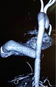 Khó khăn lớn nhất gặp phải khi thực hiện phẫu thuật cho bệnh nhân là không có vật liệu tiêu chuẩn để làm cầu nối. Đó là bộ vật liệu bao gồm ống nối cho mỏm tim, van tim nhân tạo và ống mạch nhân tạo. Các vật liệu này được thiết kế riêng cho phù hợp với việc luồn vào mỏm thất trái và đường đi của nó đến động mạch chủ xuống để không làm hẹp các miệng nối, đoạn gấp khúc và đảm bảo dẫn lưu đủ cung lượng tim [4]. Hiện ở Việt Nam chưa có bộ sản phẩm này trên thị trường. Để giải quyết vấn đề trên, chúng tôi sử dụng ống mạch nhân tạo số 27 để nối với mỏm thất trái, nối một ống mạch nhân tạo khác có gắn van (đầu ngoại vi) vào động mạch chủ xuống đoạn ngang mỏm tim. Sau đó hai đoạn này được nối lại với nhau để tạo thành một cầu nối tắt có van cho dòng máu di chuyển một chiều từ mỏm thất trái xuống động mạch chủ (Hình 4c,d,e,f,g). Lý do để chọn đoạn mạch có cỡ lớn như vậy là đề phòng trường hợp gấp khúc cầu nối dẫn đến gây hẹp và dẫn lưu không hết thể tích tống máu của thất trái. Kết quả chụp cắt lớp vi tính đa dãy đầu dò sau mổ cho thấy vẫn có tình trạng gấp khúc cầu nối trước và sau van nhân tạo (Hình 5) nhưng trên siêu âm thì chênh áp qua các chỗ này là không đáng kể cho thấy việc lựa chọn vật liệu là phù hợp.