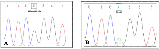 A: Gen MYH7 người bình thường không có đột biến; B: Gen MYH7 của bệnh nhân bị đột biến GàA tại vị trí 10164.