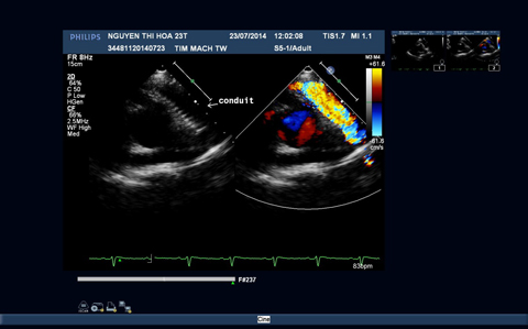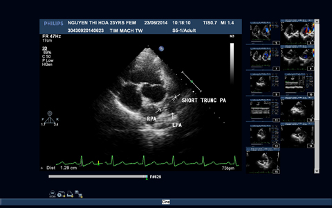 Trên siêu âm tim, bệnh nhân được chẩn đoán teo tịt van động mạch phổi kèm thông liên thất (PA-VSD). Teo tịt van ĐMP, gốc động mạch phổi và phần lớn thân động mạch phổi; chỉ còn một phần thân động mạch phổi với hội lưu và hai nhánh động mạch phổi, còn ống động mạch, kích thước và chức năng tâm thu thất trái bình thường, đường kính thất phải bình thường, hở chủ nhẹ. Do PA-VSD là dị tật tim bẩm sinh phức tạp, bệnh nhân nếu mang thai nguy cơ cho cả mẹ và con đều rất cao, mặt khác trên lâm sàng bệnh nhân đã có tím và giảm độ bão hòa oxy máu do đó bệnh nhân có chỉ định đình chỉ thai.