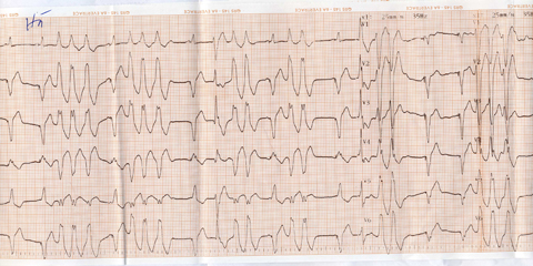 Hình 1. Hình ảnh điện tâm đồ có tim nhanh thất không bền bỉ với ổ ngoại vị từ đường ra thất phải ở ca lâm sàng số 3. ở những phức bộ nhịp xoang, chúng ta thấy được có spike của tạo nhịp 2 buồng thất đứng trước.