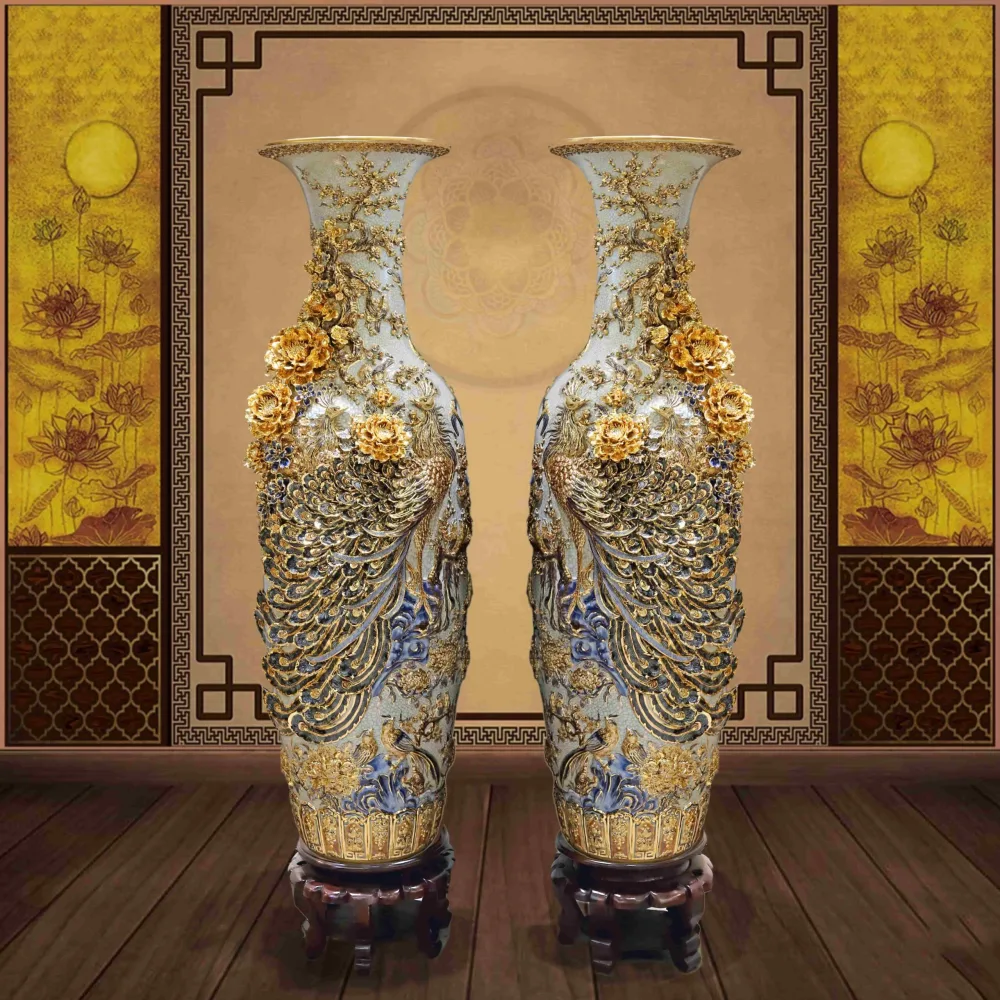 Lọ lộc bình Phú Quý Trường Xuân đắp nổi men rạn cao cấp Bát Tràng Vạn An Lộc với đôi chim công biểu tượng cho tiền tài uy quyền. Hoa mẫu đơn mang ý nghĩa sự phú quý, giàu sang cũng như may mắn trong tình yêu. Cây hoa đào được đắp cạnh đôi chim công có ý nghĩa mang nguồn sinh khí mới, sự sinh sôi nảy nở, ẩn chứa mong muốn gia đình an khang thịnh vượng, công việc thuận lợi phát tài, gia đình vui vẻ, mang đến niềm tin, hy vọng về những điều tốt đẹp .